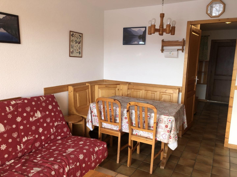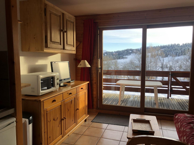Loue studio cabine, exposition plein sud avec magnifique vue sur le massif du Beaufortain, situé au rez-de-chaussée, au pied des pistes, et au centre de la station à 150 m des commerces.