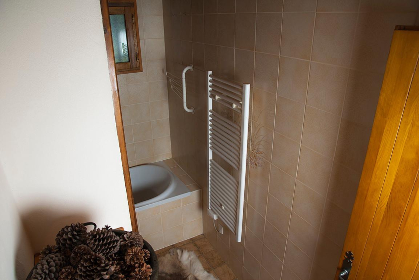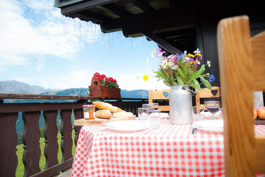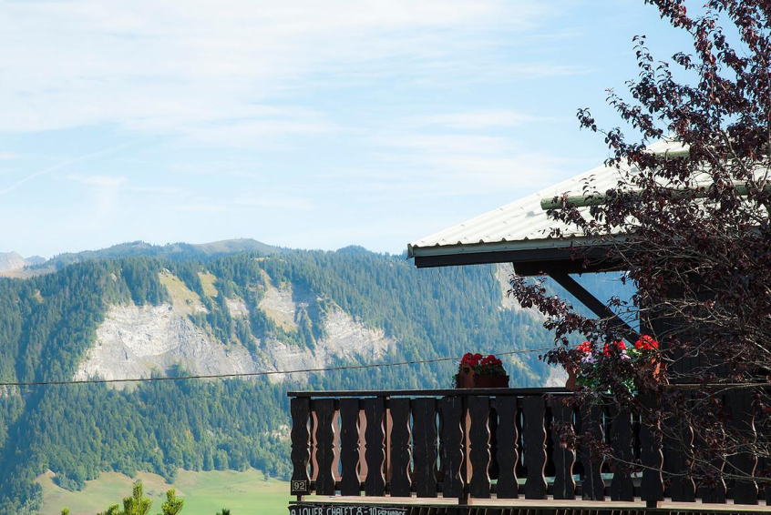 Sur le cote sud du chalet se trouve un grand balcon/terrasse (40 mètres carrés). De ce balcon et du jardin, on a une vue magnifique sur la chaîne des Aravis et la vallée en dessous.