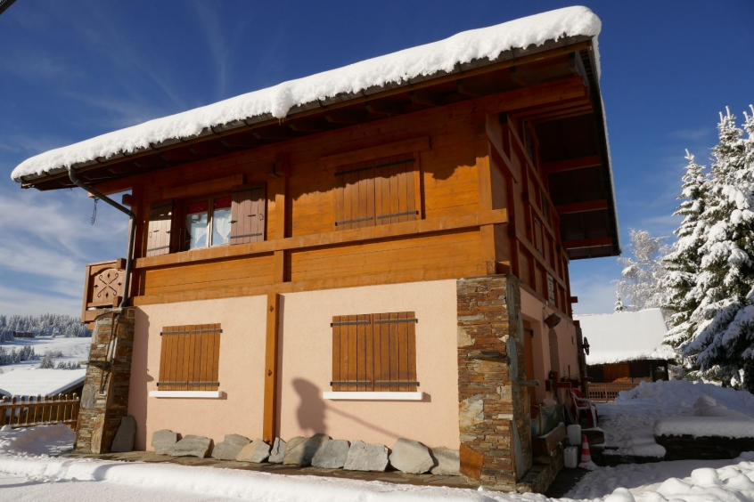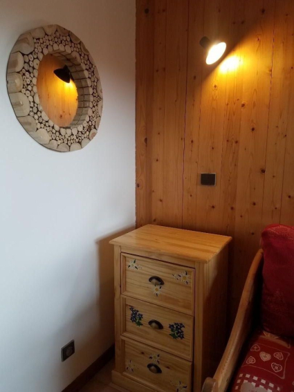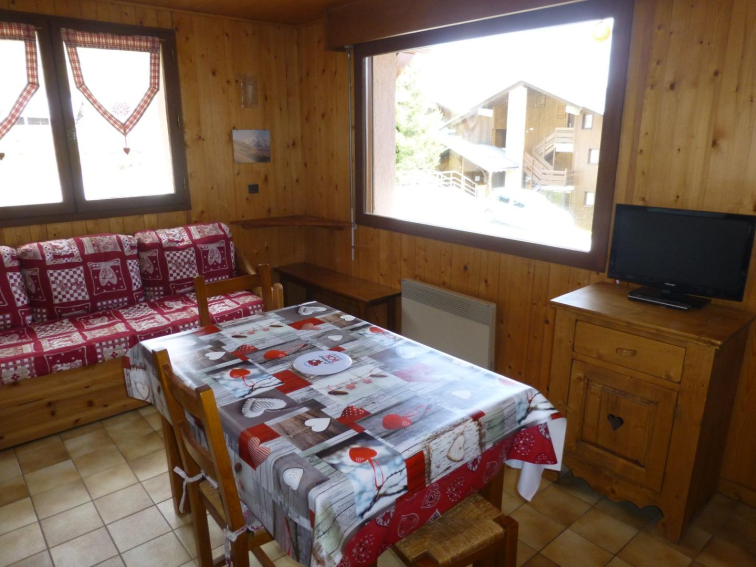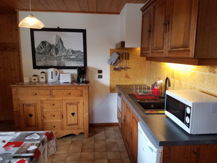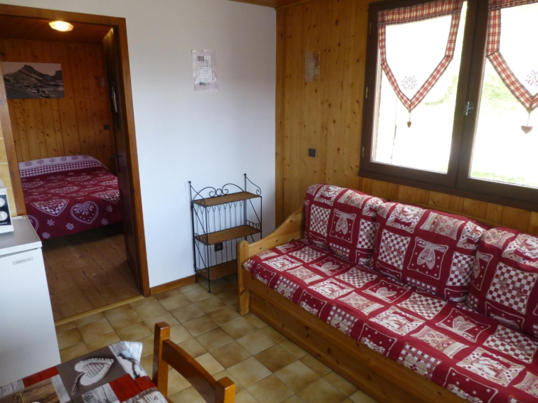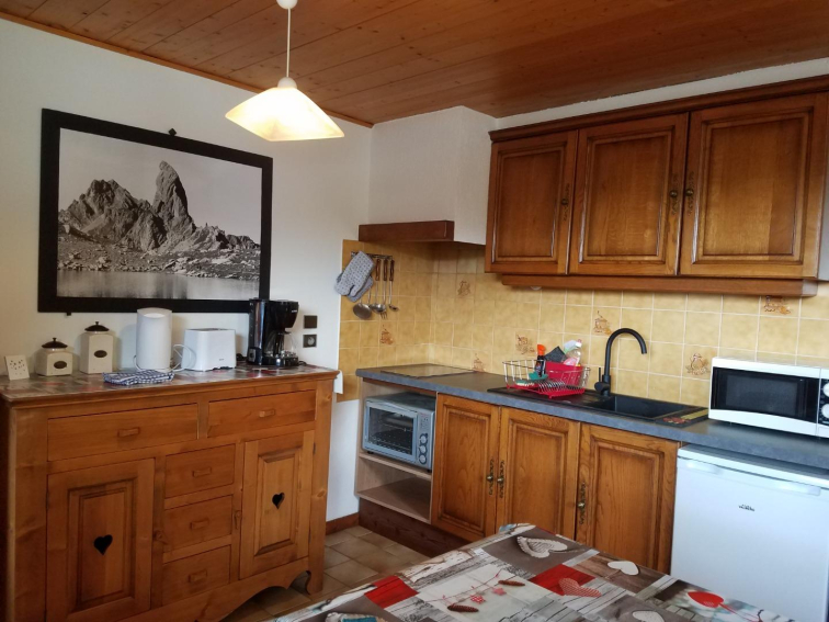 Charmant petit appartement dans chalet de 29m2, pour 4 personnes, 1 chambre avec un lit 2 places et un séjour avec coin cuisine tout équipé: canapé convertible 2 couchages, cuisinière et four électrique, four micro onde, TV, une salle de bain avec WC et douche.