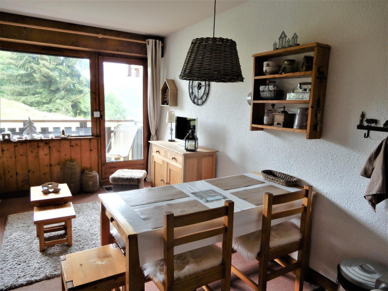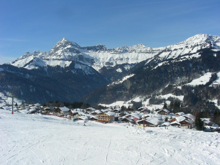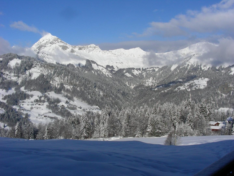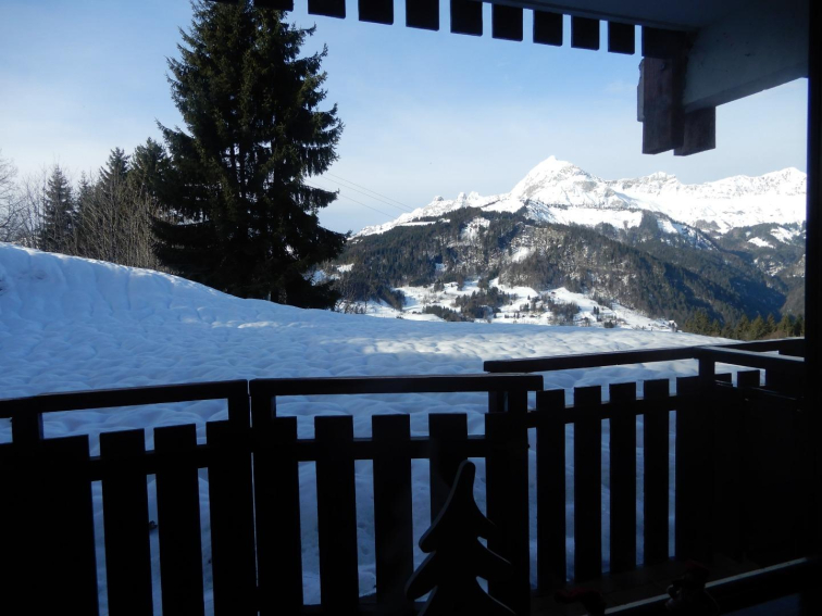Balcon sous loggia, exposition SUD/OUEST, vue magnifique sur la chaîne des Aravis et le Mont Charvin (aucun vis-à-vis). Le balcon donne accès sur le jardin (RARE EN STATION). Accès par un portillon.