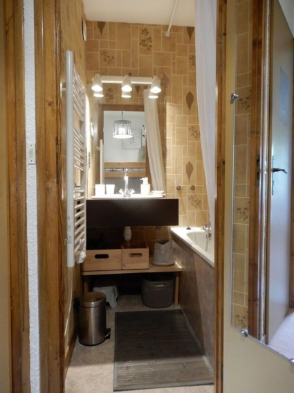 Salle de bain avec baignoire, radiateur sèche serviettes et sèche cheveux, tapis de bain en bambou. Marche pieds pour les petits enfants.
