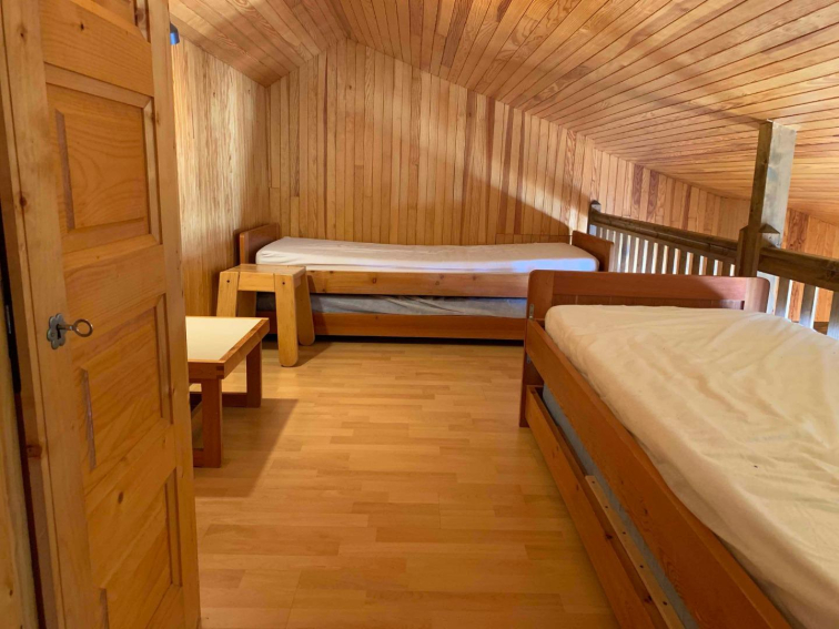 - Mezzanine de 13m2 avec vue sur le niveau du dessous, avec 2 lits gigogne et placard coulissant (penderie, ...)