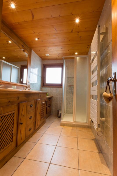 une salle de bain, avec douche et 2 lavabos