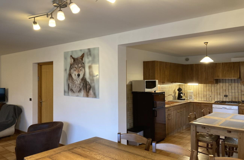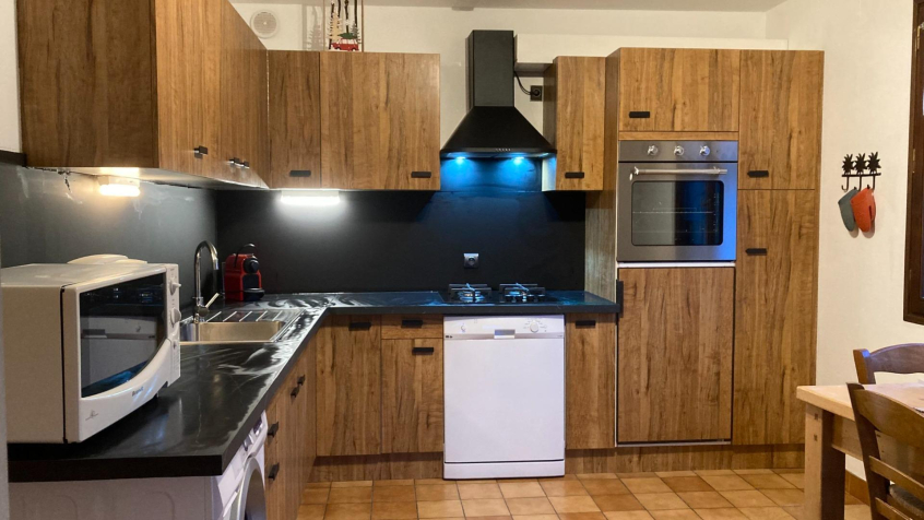 Lave-Vaisselle, Four, 4 feux gaz, Réfrigérateur avec compartiment congélateur, Télévision, Chauffage électrique, Placard privatif dans l’entrée commune. Vue dégagée sur la montagne et les pistes.