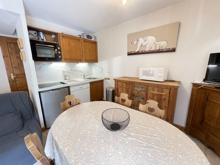 *Une cuisine ouverte : plaques vitrocéramique, réfrigérateur, mini-four, micro-ondes et lave-vaisselle