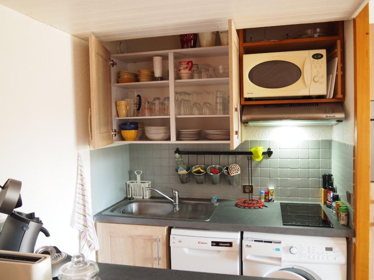 La pièce principale propose de nombreux placards de rangements. Une cuisine toute équipée (lave-vaisselle, four, four à micro-onde, machine à laver, machine à café à filtre, machine à café dosettes Senseo, appareil à raclette, plat à fondue, grille pain, bouilloire etc...).