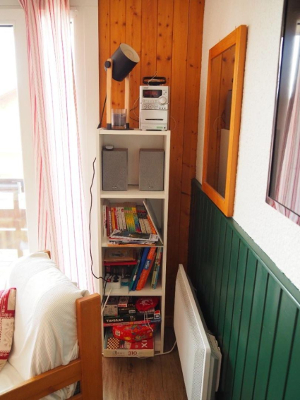 L'espace salon contient un canapé lit (avec vrai matelas de 140 cm) dépliable et repliable très rapidement, une TV, un espace multimédia avec chaine HIFI, jeux de société, coloriage, infos randos/activités etc...