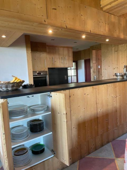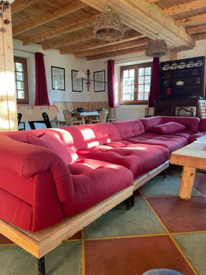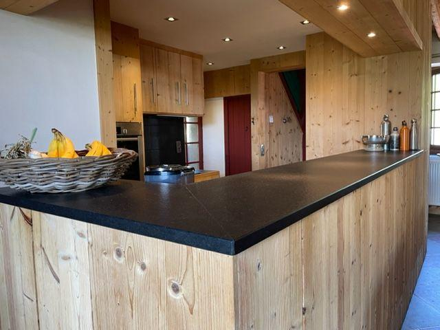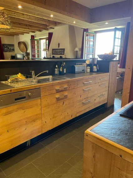 Grand salon de 80 mètres carrés avec cheminée au rez de chaussée, cuisine ouvrant sur le salon, local skis indépendant de 20 mètres carrés en sus. Toilettes et salle de douche.