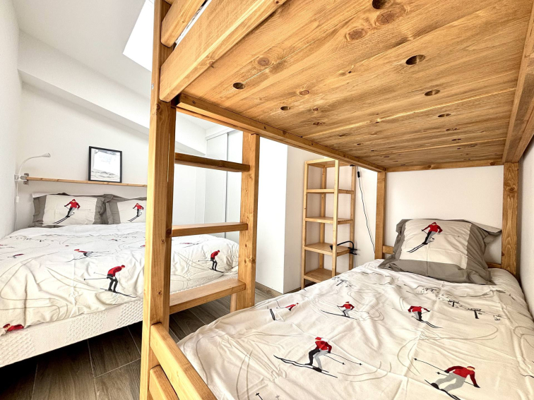 - Une chambre avec placards, un lit double (140 cm) et lits superposés (2 * 90 cm)