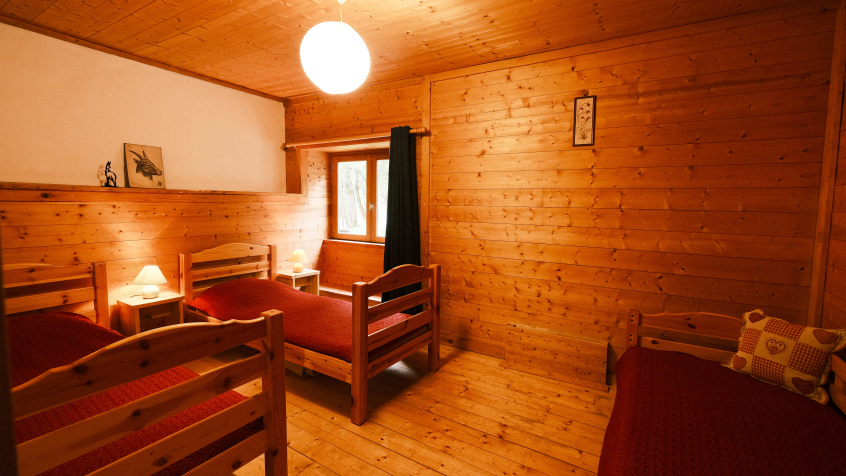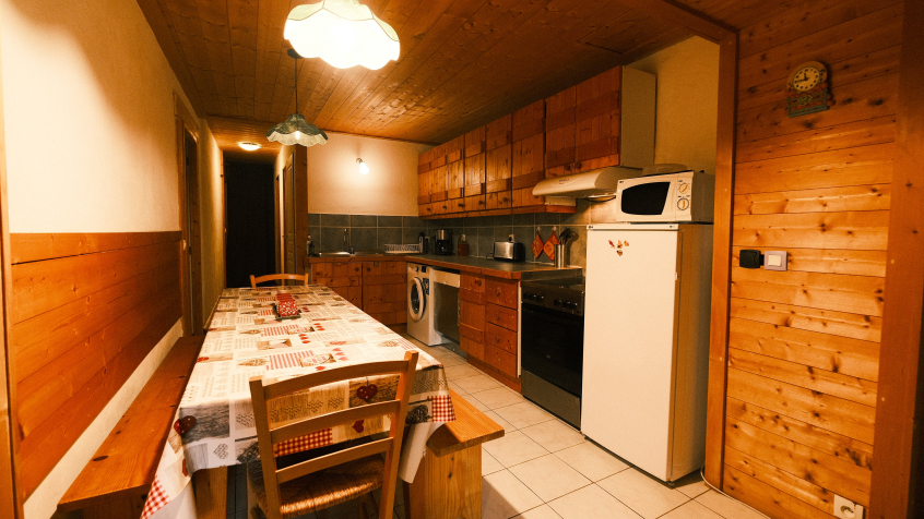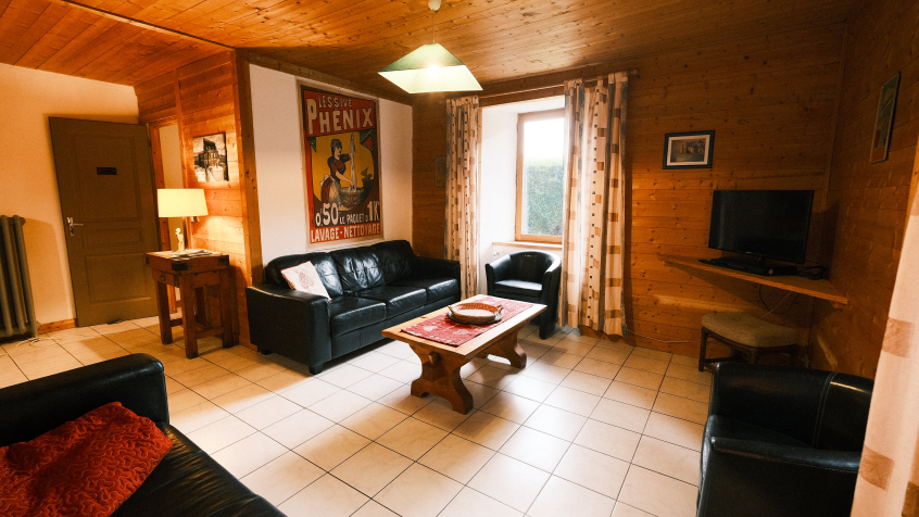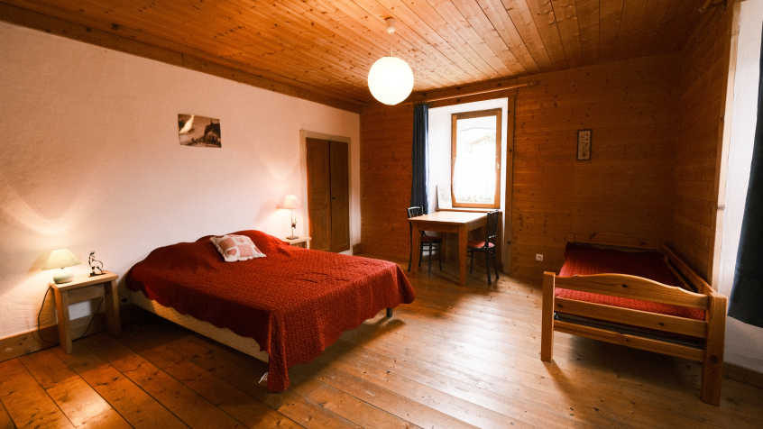 Appartement en rez-de-chaussée d’environ 80 m², pouvant accueillir jusqu'à 9 personnes, comprenant 3 chambres, dans la ferme de La Revue, vieille ferme savoyarde située légèrement à l'écart du village de Flumet.