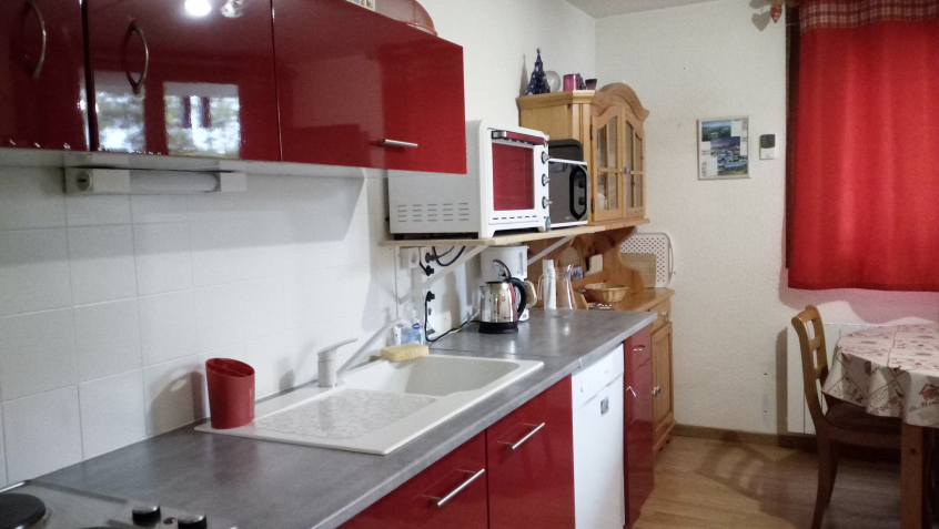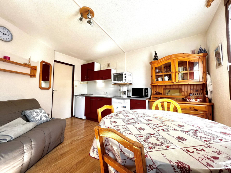 Séjour avec grande cuisine bien équipée récente, télévision et balcon orienté sud-ouest.