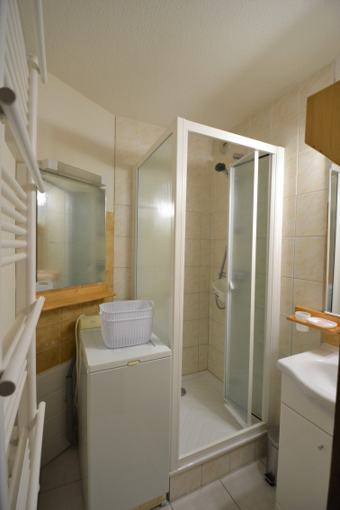 Salle de bain avec douche, lave linge, toilettes séparées.